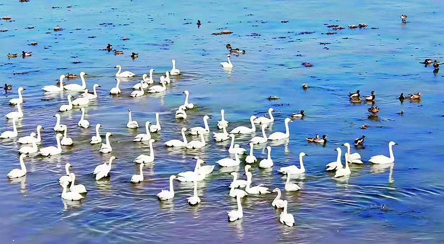 察右前旗黄旗海当然保护区雷同是候鸟云集。经责任主谈主员监测,这里不雅测到国度二级保护野活泼物大天鹅430余只、小天鹅760余只,斑嘴鸭、针尾鸭、赤颈鸭等十余种鸟类以为13000余只。成群的候鸟或栖息于湖面,或觅食于浅滩,广阔的数目、丰富的种类,让这片湿地尽显生态活力,成为北疆大地上沿途靓丽的生态现象线。