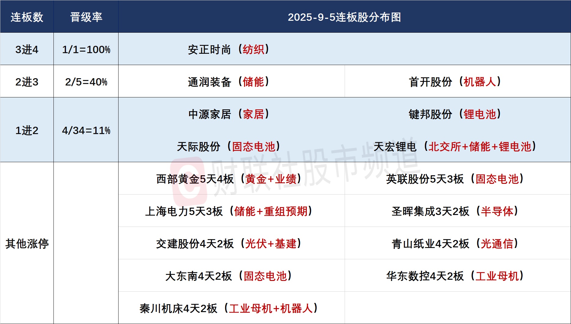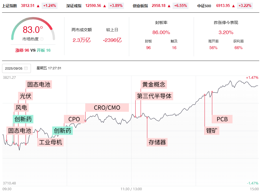 财联社9月5日讯,当天96股涨停,16股炸板,封板率为86%,安正前锋4连板,通润装备(维权)、首开股份(维权)3连板,西部黄金5天4板,上海电力、英联股份5天3板,北交所天宏锂电30cm2连板。市集全天动荡走高,创业板指领涨,沪指再行站上3800点。沪深两市全天成交额2.3万亿,较上个往返日缩量2396亿。盘面上,市集热门辘集在新动力目的,个股涨多跌少,全市集超4800只个股上升,着落个股不及500只。板块方面,固态电池、光伏、CPO、第三代半导体等板块涨幅居前,银行、乳业等少数板块着落。终端收盘,沪指涨1.24%,深成指涨3.89%,创业板指涨6.55%。