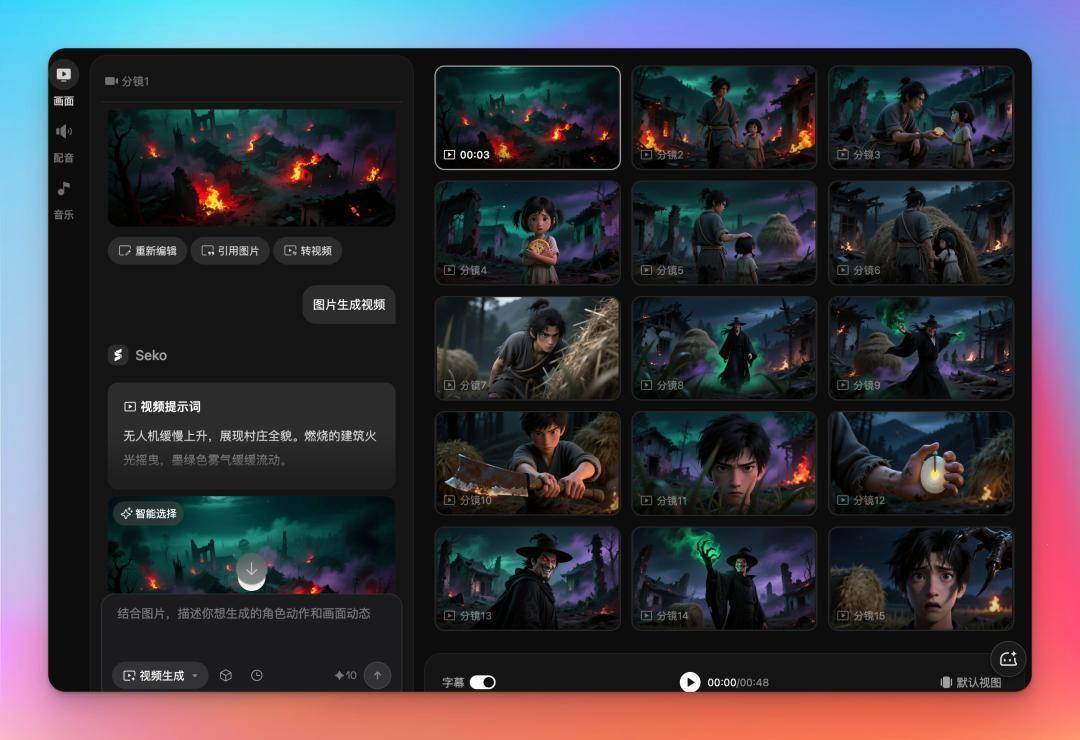 信得过作念到了一句话(或者一份脚本),Agent 就不错自动完成脚本填充、东谈主物、场景、格调设定,自动批量制作分镜图以及自动批量生视频,终末导出完好意思视频。