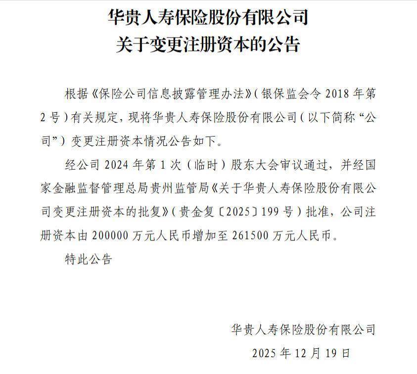 蓝鲸新闻12月20日讯(记者 陈晓娟)“茅台系”险企荣华东谈主寿保障股份有限公司(下称“荣华东谈主寿”)完成新一轮增资。日前,公司公告,经金融监督处理总局贵州监管局批准,公司注册成本由20亿元增多至26.15亿元。不外,公告并未明确具体出资方及出资比例情况。